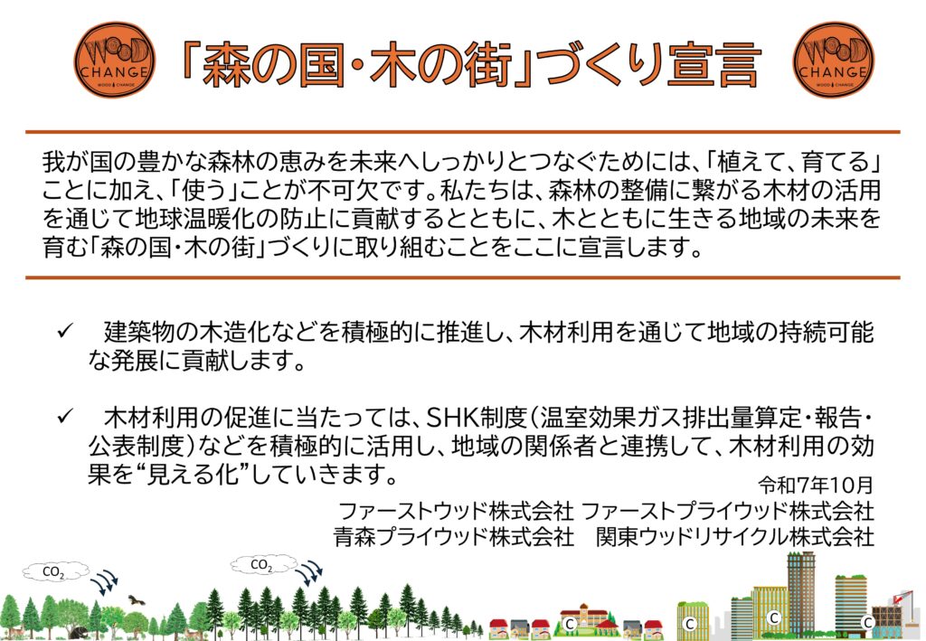 ファーストウッドグループ(ファーストウッド株式会社、ファーストプライウッド株式会社、青森プライウッド株式会社、関東ウッドリサイクル株式会社)は、2025年10月、林野庁が推進する「『森の国・木の街』づくり宣言」に賛同し、同制度に参画いたしました。