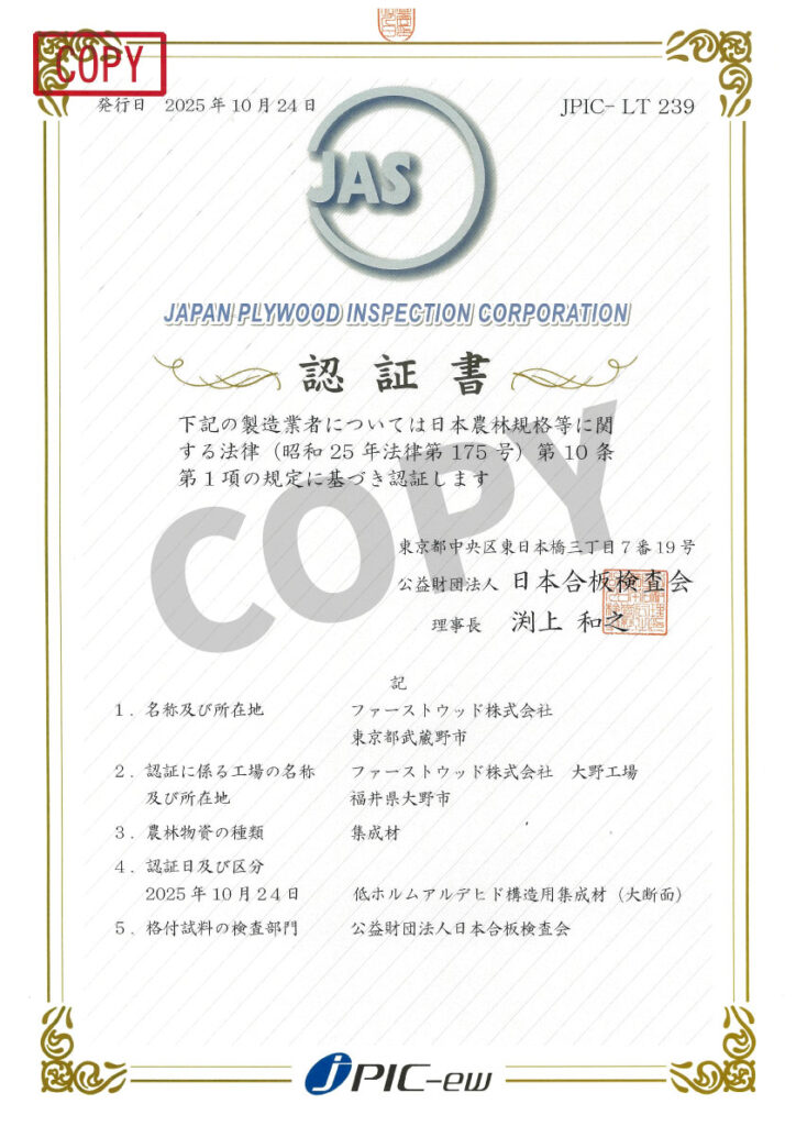 ファーストウッド株式会社(本社:東京都武蔵野市、代表取締役社長:大河龍也、以下「当社」)は、2025年10月24日付で、建築構造材の大断面集成材において、日本農林規格(JAS)認証を新規取得いたしました。