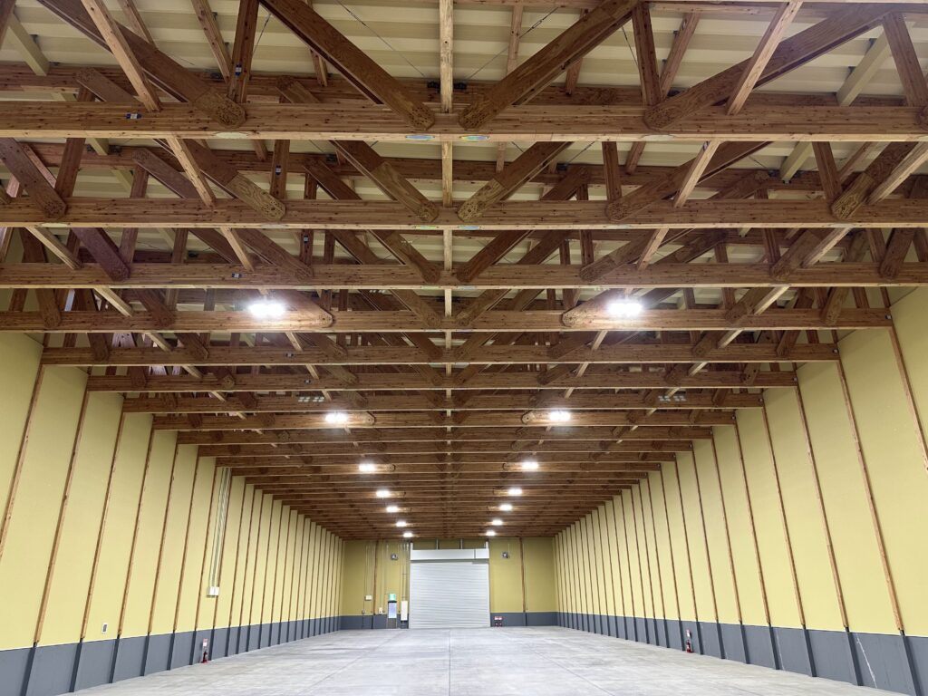 大型倉庫の場合、鉄骨造が一般的ですが、今回の取り組みにより、木造化による環境貢献、原木産地指定による地域材活用、一般流通材によるコスト抑制、および、トラス構造による大空間確保という多様な価値を実証することが出来ました。